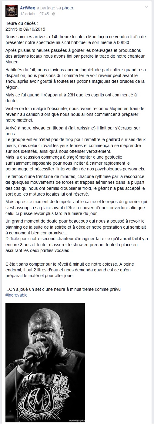 Après tout, si les membres du groupe sont surpris, ils l’auront bien cherché. Souvenez-vous du message qu’ils ont posté il y a une dizaine de jour … Vous ne l’avez pas lu ? Il est assez bien écrit pourtant. Nous partageons ce grand moment avec vous par une jolie capture d’écran (le clip est aussi en dessous), un canular du 12 octobre dernier digne d’un 1er Avril. Merci au groupe et amusez-vous bien !